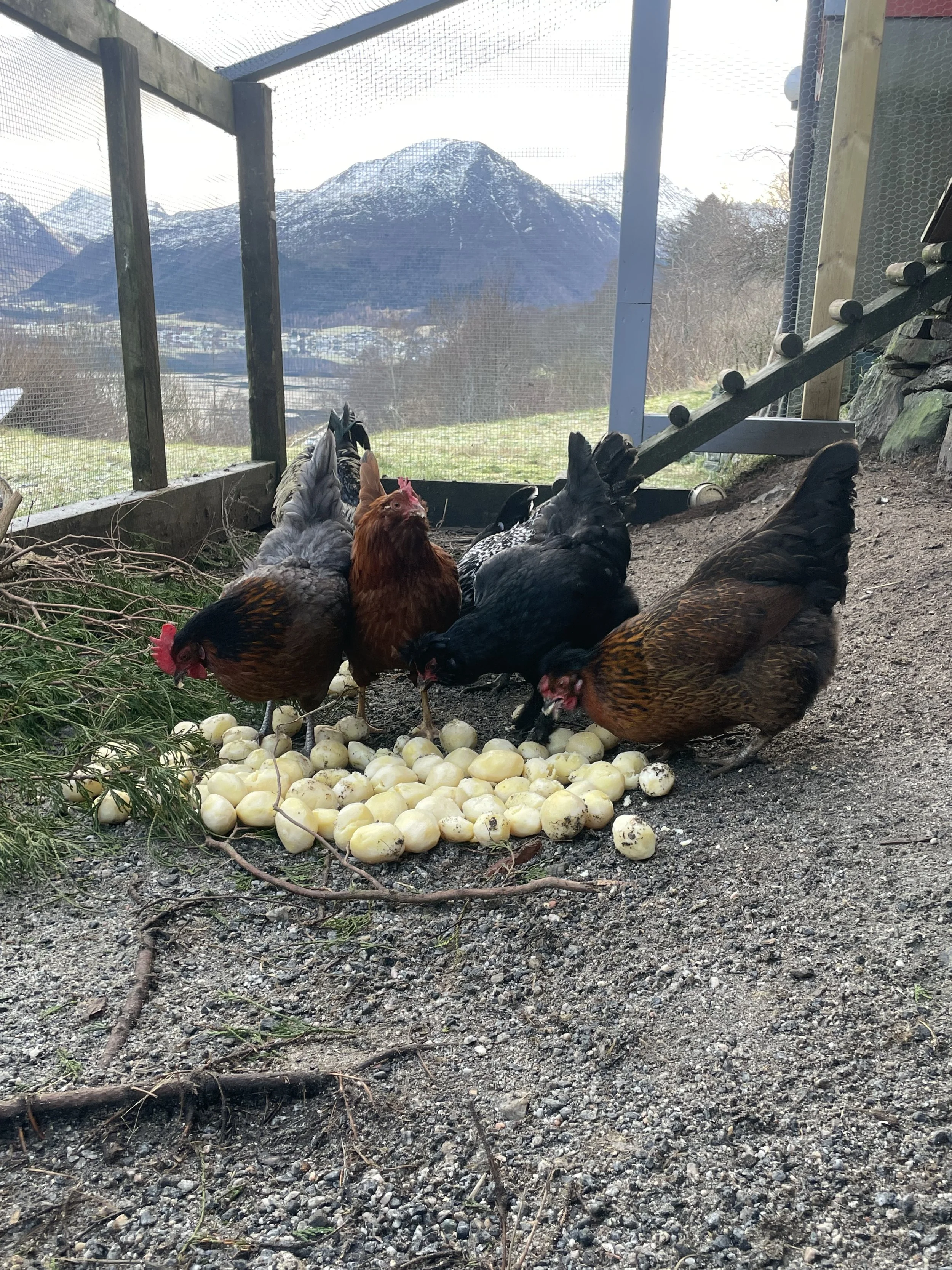 Det var vel høner som startet hele greia. Høner i hagen i byggefeltet der vi bodde før.Og høner er kjekke fugler, for du vet det nok ikke helt selv når du skaffer de at du etterhvert vil få lyst på både sau og ku. Men, vi skaffet oss høns og holdt oss selvforsynte på egg store deler av året. Det var en god følelse! Så etter 3 forskjellige hønsehus fikk vi oss altså en gård..10 timers kjøretur unna. Og de første dyra (utenom Lin) ble altså 6 verpehøns og en hanefar. Takknemlige skapninger disse her. Anbefales!