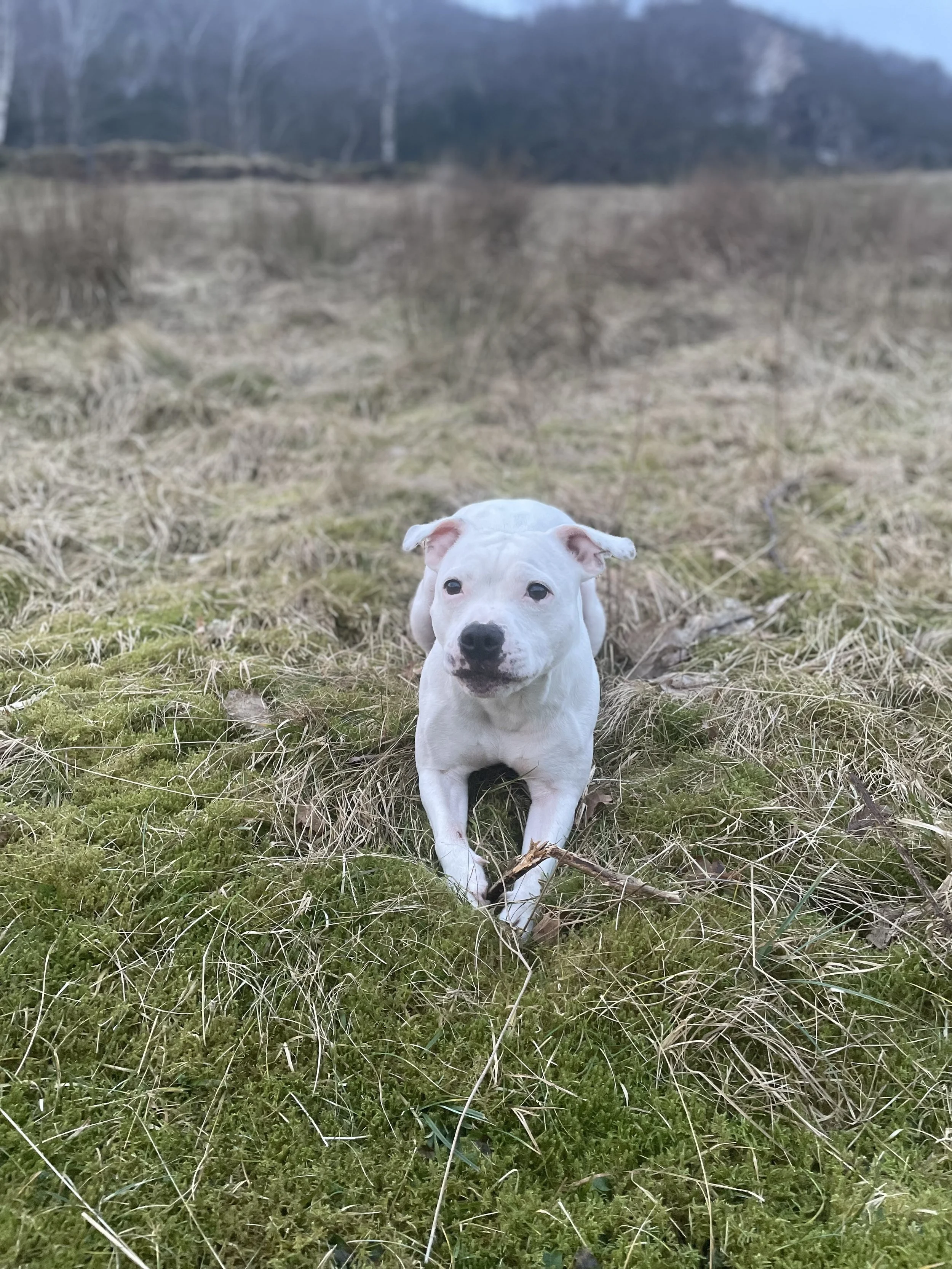 Lin (vår tredje Staffordshire Bull Terrier) kom til oss som omplasseringshund i desember 2024, kort tid før huset vårt på Sandnes ble pakket ned og flyttebilen dro nordover. Hun nyter livet som gårdshund og er den mest oppmerksomhetssyke hunden vi har vært borti noensinne. Kommer noen på besøk her- ja, da er det Lin som har fått besøk (tror hun selv da). Hun er koseklump og sofagris, fjellgeit og Ferrari- alt i ett. Hun passer like godt inn på gården her i fjellsiden langs Syvdefjorden som hun passer inn i armkroken i sofaen.